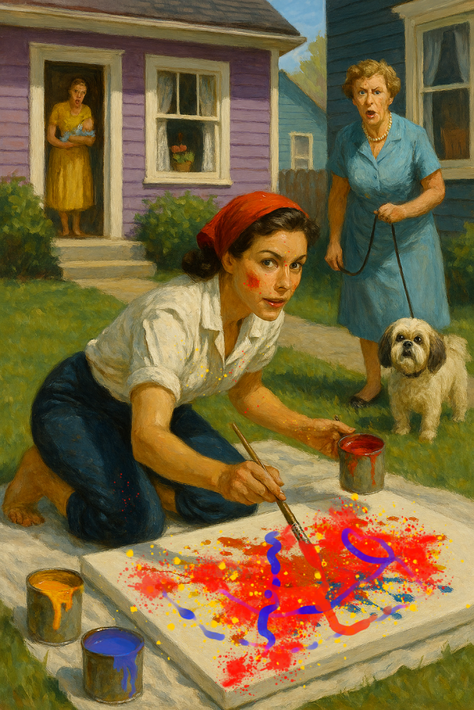 “Familiar with… splattering paint?” Mrs. Embleton stammered, tightening her grip on Muffin’s leash.