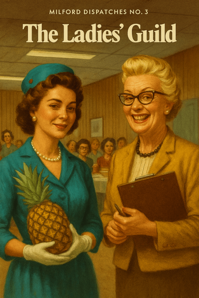 “Hello Mrs. Embleton. Mrs. Vance invited me earlier today. I’d have prepared something more formal, if I’d have known sooner,” Evelynna held out the pineapple in her gloved hands like a beacon. “Brought this from Chicago. Perfectly ripe. Thought the ladies might enjoy.” Mrs. Embleton swallowed hard and tightened her grip on the clipboard.