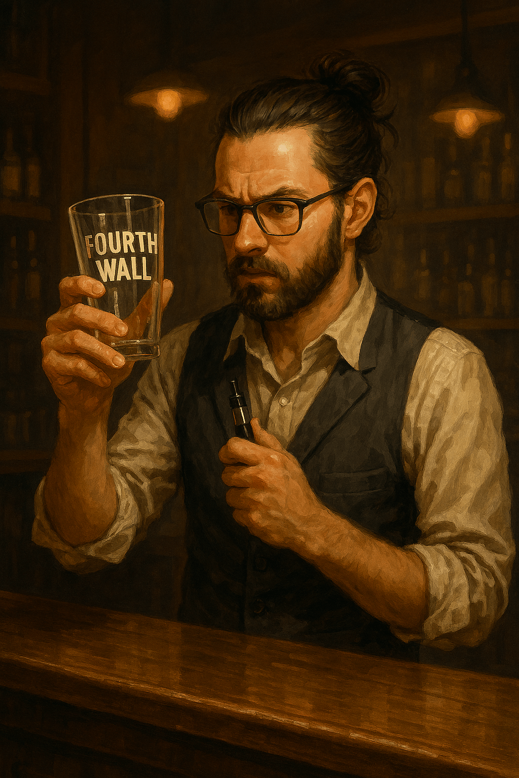 “I’ve ordered more, but it’s gonna be a while until it ships with the custom Fourth Wall logo,” Mik sighed. Each glass had to have the Fourth Wall name and logo printed on it, per the owner Todd’s insistence. Todd didn’t come in much, and we all preferred it that way.